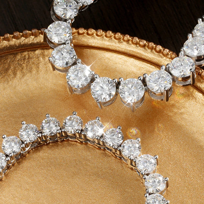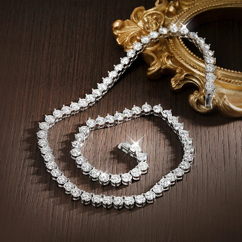 Experience unmatched brilliance with the Moissanite Tennis Necklace, a luxurious statement of precision and craftsmanship. Made from solid 925 sterling silver, each D Color VVS1 moissanite is meticulously secured in a 3-claw prong setting, ensuring maximum sparkle and strength. Available in 3mm, 4mm, and 5mm sizes, this GRA-certified unisex necklace delivers the same fire and clarity as natural diamonds — perfect for both men and women who appreciate timeless elegance with modern edge.