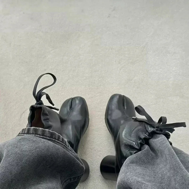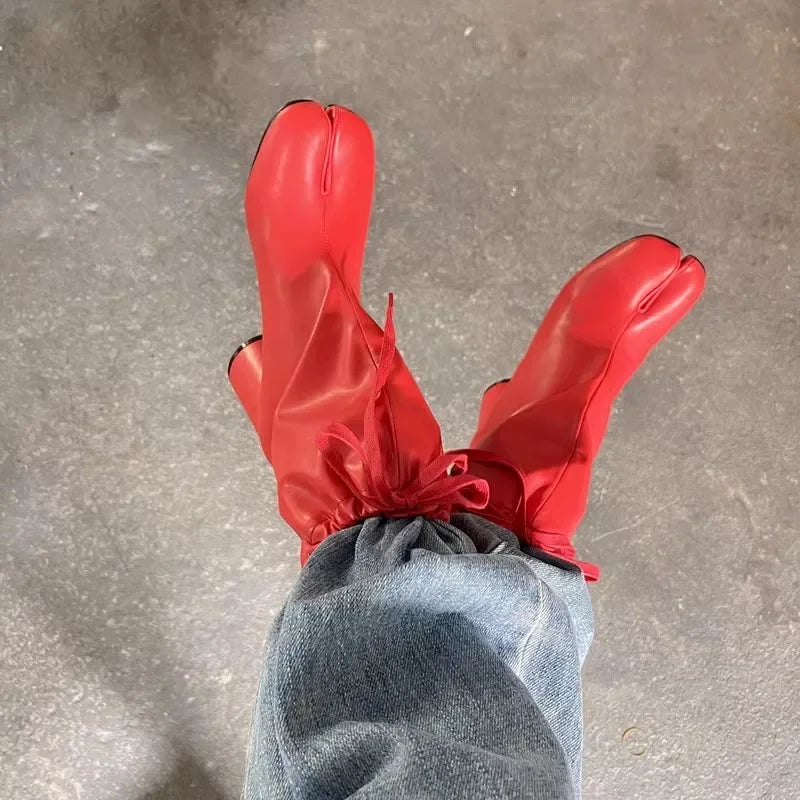 Step into the new season with these luxury designer split-toe ankle boots, featuring a fashion-forward ruffle accent and bold chunky high heel. Crafted for women who value style, comfort, and statement footwear, these short lace-up boots are perfect for winter wear or elevating any outfit. The unique design merges modern elegance with edgy sophistication, making them a must-have addition to your fashion collection.